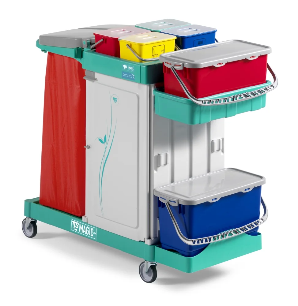 Конфигурации системы Magic разработаны специально для тех, кому требуется интегрированная система мойки в тележке. Они оснащены ведрами емкостью 4 литра с цветовым кодированием и прозрачными крышками и колесами диаметром 125 мм