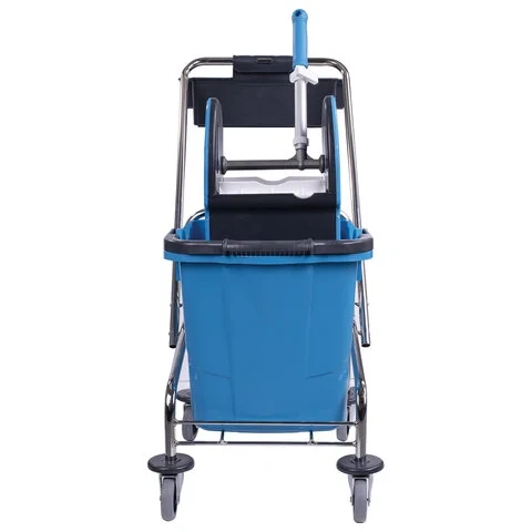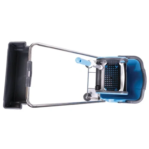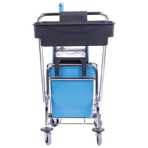 Представляет собой металлическую платформу на колесах с ведром объемом 25 л, механическим отжимом и корзинкой для бытовой химии на ручке. Корпус платформы изготовлен из хромированного металла, а инвентарь - из пластика. Тележка выполнена в двухцветном исполнении: синий и серый. Колеса позволяют перемещаться в произвольном направлении.