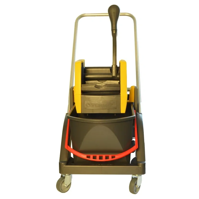 Многофункциональная уборочная тележка Vermop Аква с отжимом 2 ведра по 17 л (артикул производителя 614392) оснащена двумя ведрами емкостью 17 литров. Ее база изготовлена из прочного антивандального пластика, что обеспечивает хорошую устойчивость к механическим повреждениям. Надежный, высококачественный пластик позволяет экономить вес конструкции и в то же время гарантирует длительный срок службы. Тележка отличается компактными размерами и небольшим весом, что облегчает ее транспортировку. Для дополнительного удобства предусмотрена перекидная ручка. По сравнению с тележками других производителей разных ценовых сегментов тележки Vermop выделяются самой низкой стоимостью владения (цена приобретения/срок эксплуатации).