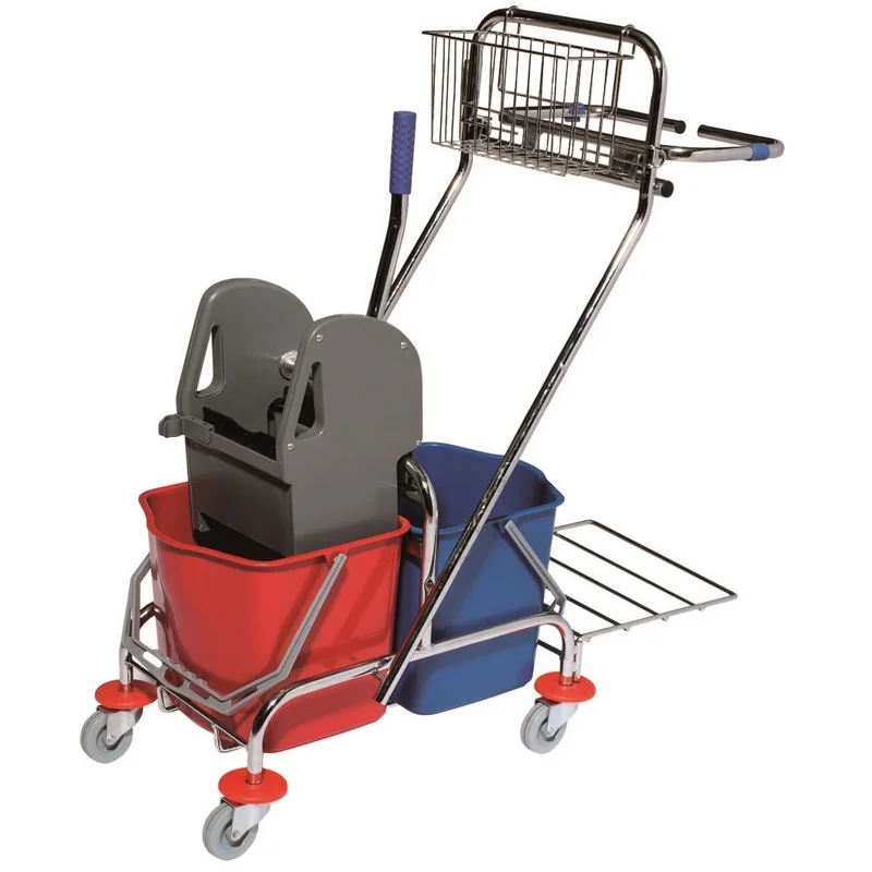 В комплект входит 2 съемных ведра 15 л, механический отжим для двух типов МОПов — «Кентукки» и плоских, металлическая сетка-лоток для хранения бытовой химии и других мелочей, держатель мешка (мешок в комплект не входит). На тележке есть съемный держатель для мешка и съемный поддон которые навешены на базу тележки с внешней стороны.