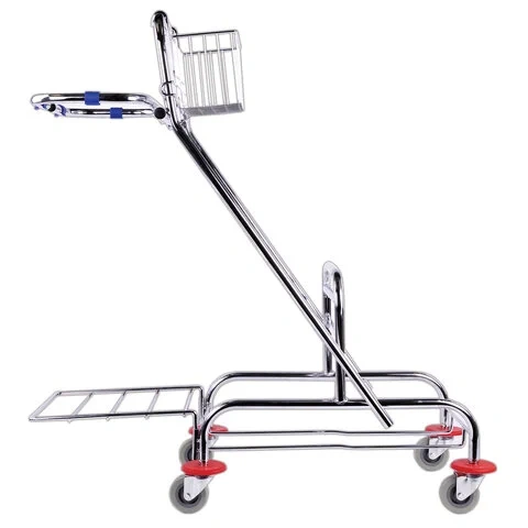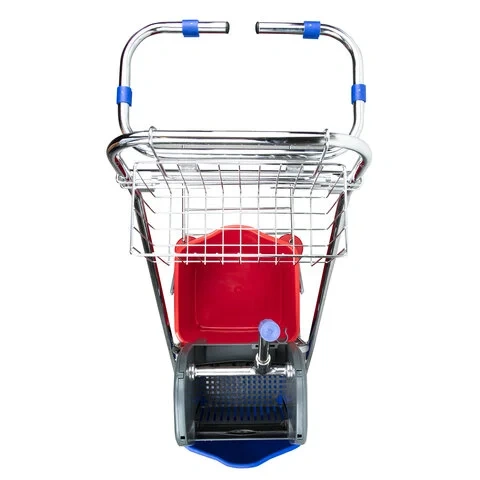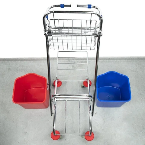 Представляет собой металлический каркас с установленным на него механическим отжимом для веревочных и плоских МОПов (плоские МОПы для удобства лучше использовать с УШАМИ (в наименовании У (УШИ) или У/К (УШИ / КАРМАНЫ), двумя съемными ведрами по 15 литров, корзиной для бытовой химии, держателем для мешка и металлическим поддоном. База изготовлена из качественного металла, а инвентарь (ведра и отжим) из пластика. Колеса позволяют перемещаться в произвольном направлении. Имеются защитные колпачки на колесах.