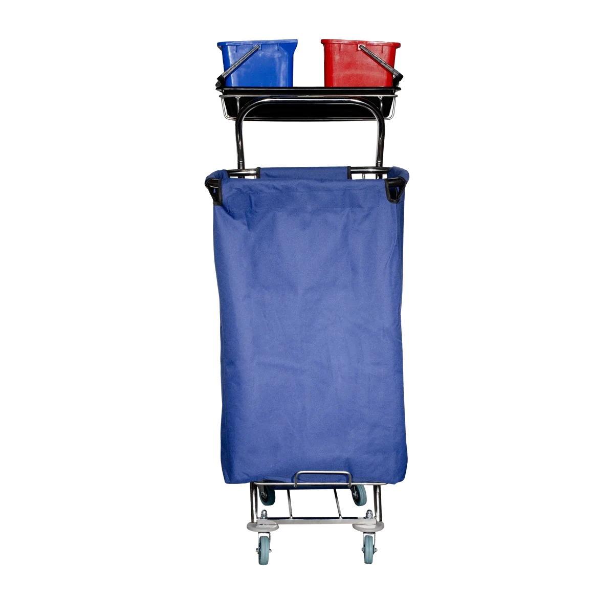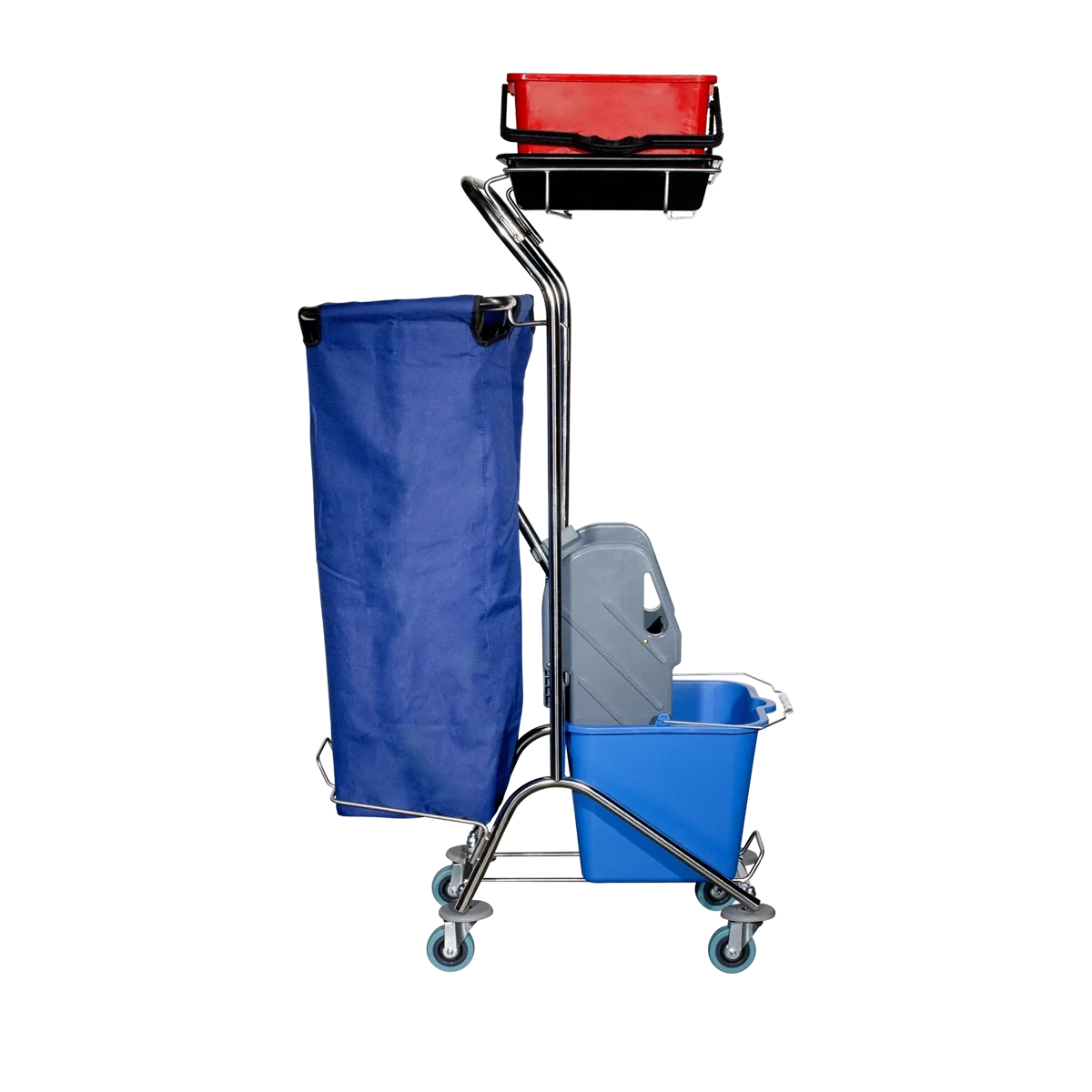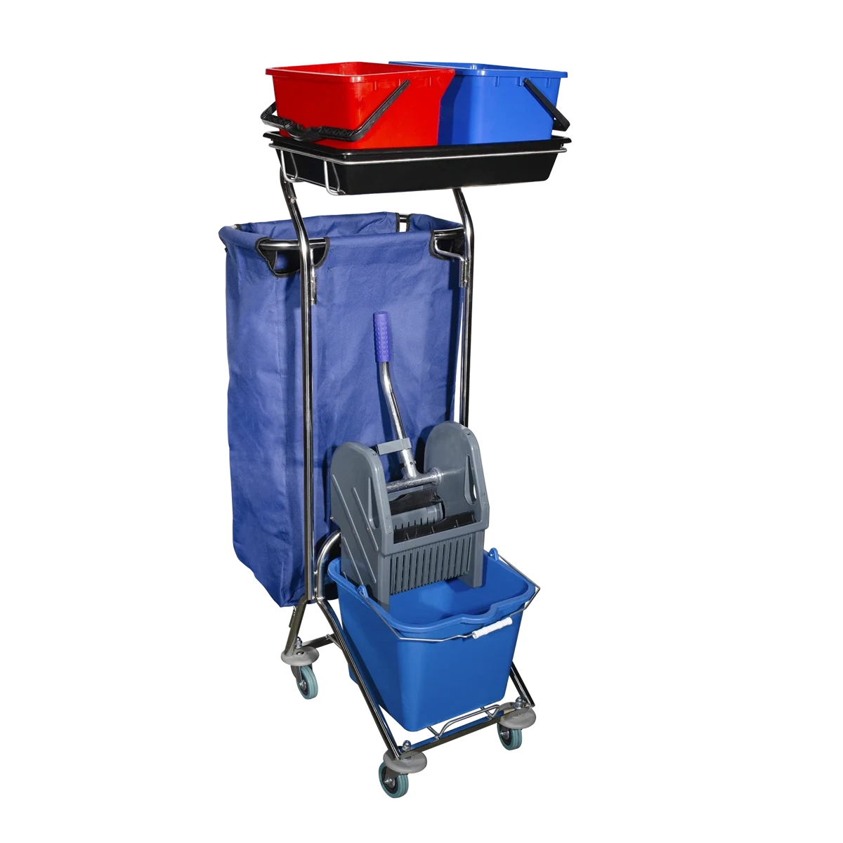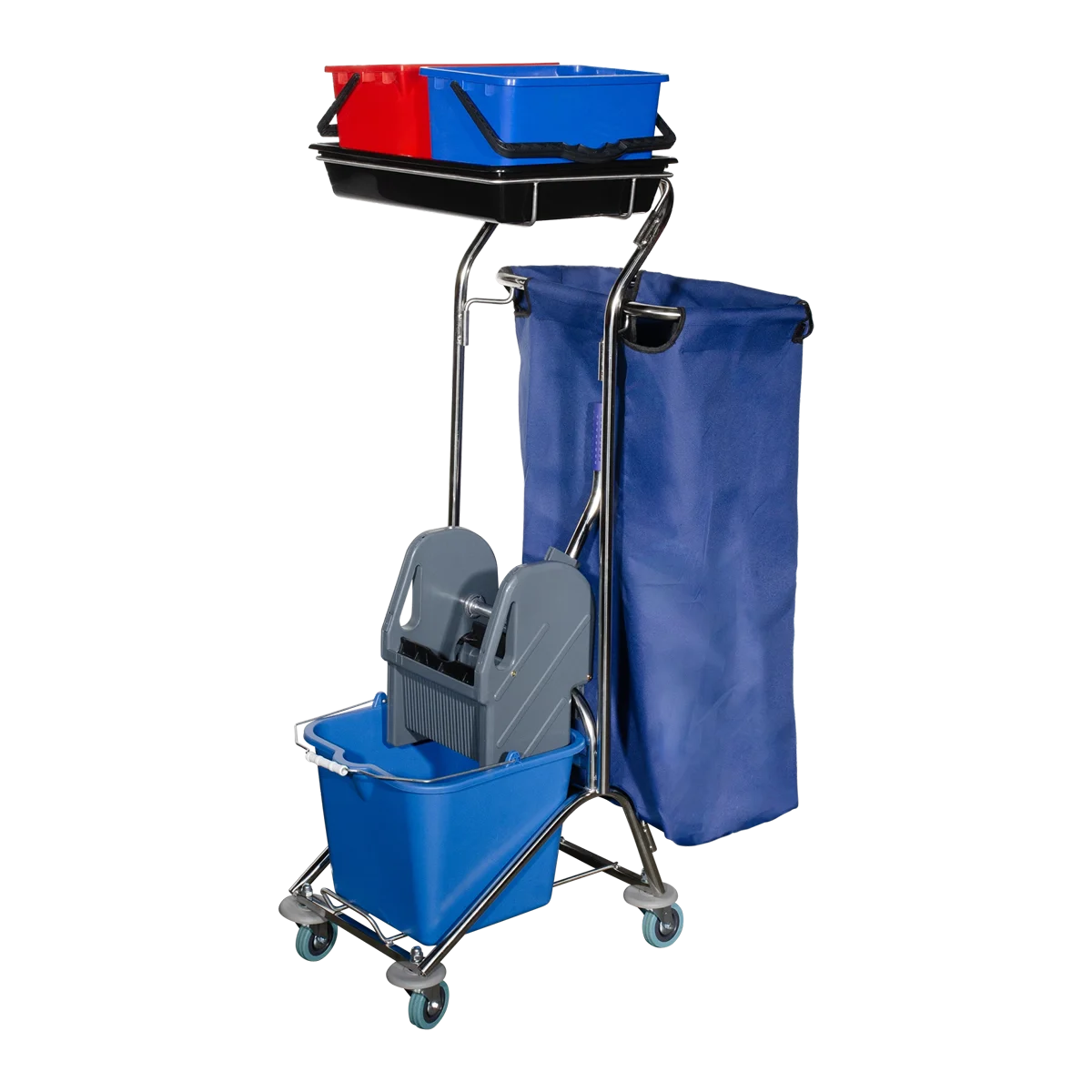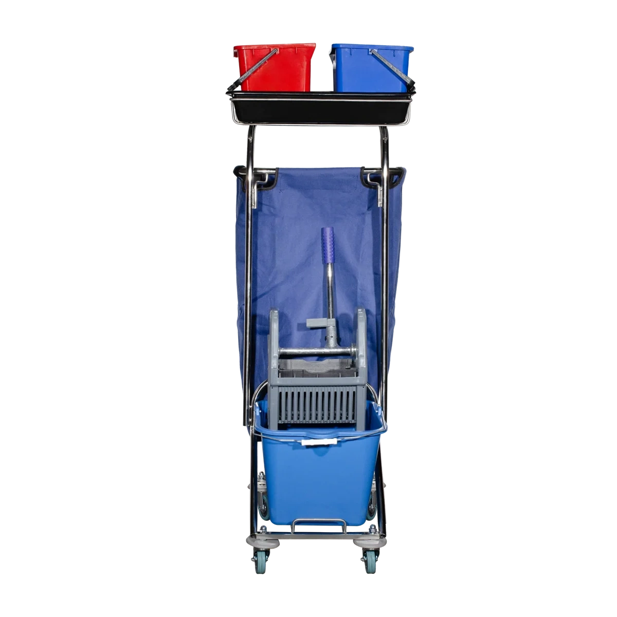 Комплексная уборочная тележка Merida с тремя съемными ведрами, лотком и держателем мешка.