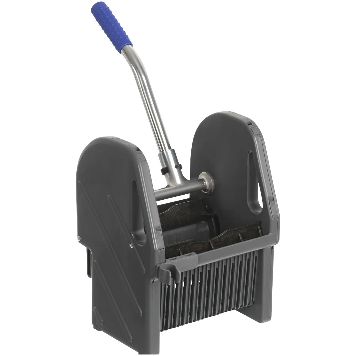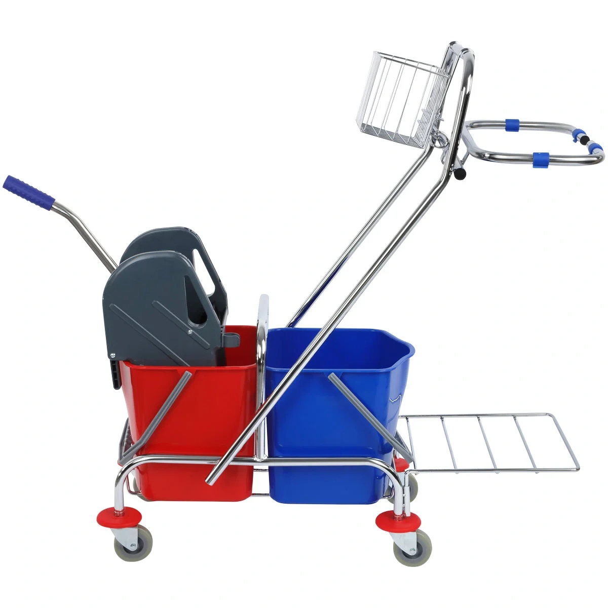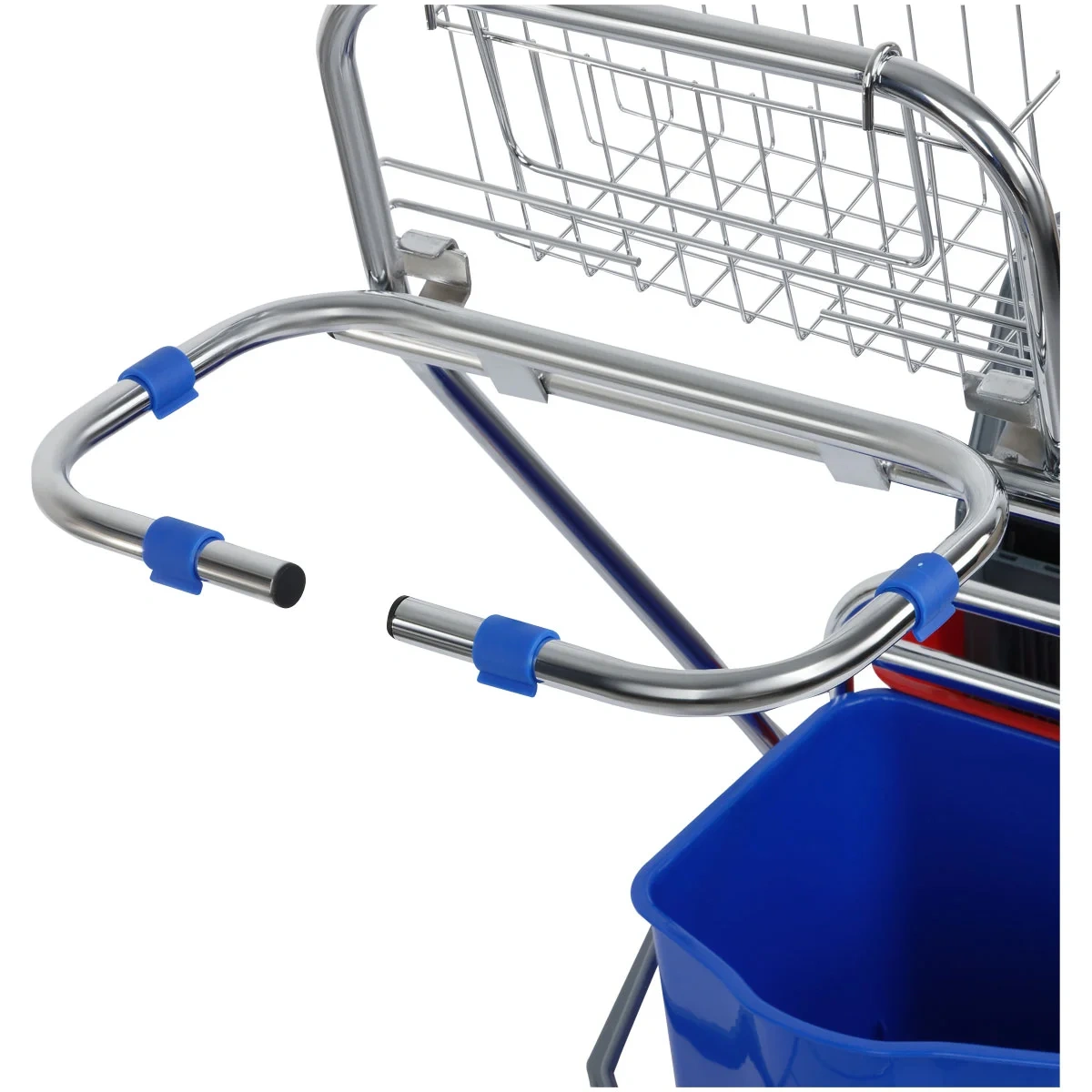 Тележка двухведерная с отжимом для петельных тряпов и МОПов, хромированный стальной каркас и перекидная ручка. Поворотные колеса с пластик.протекторами и бамперами. Два съемных ведра по 15л. с носиками для слива. Механический отжим для веревочных и плоских МОПов. Метал. сетка-лоток для хранения бытовой химии и других мелочей. Держатель для полиэтиленового мусорного мешка (мешок в комплект не входит). Для тележки подходят швабры: 265261 + 265262, 266773 и насадки 271110, 271107, 271108, 271109, 303275, 303089 в комплекте с рукоятками/черенками 303092 и 303272.