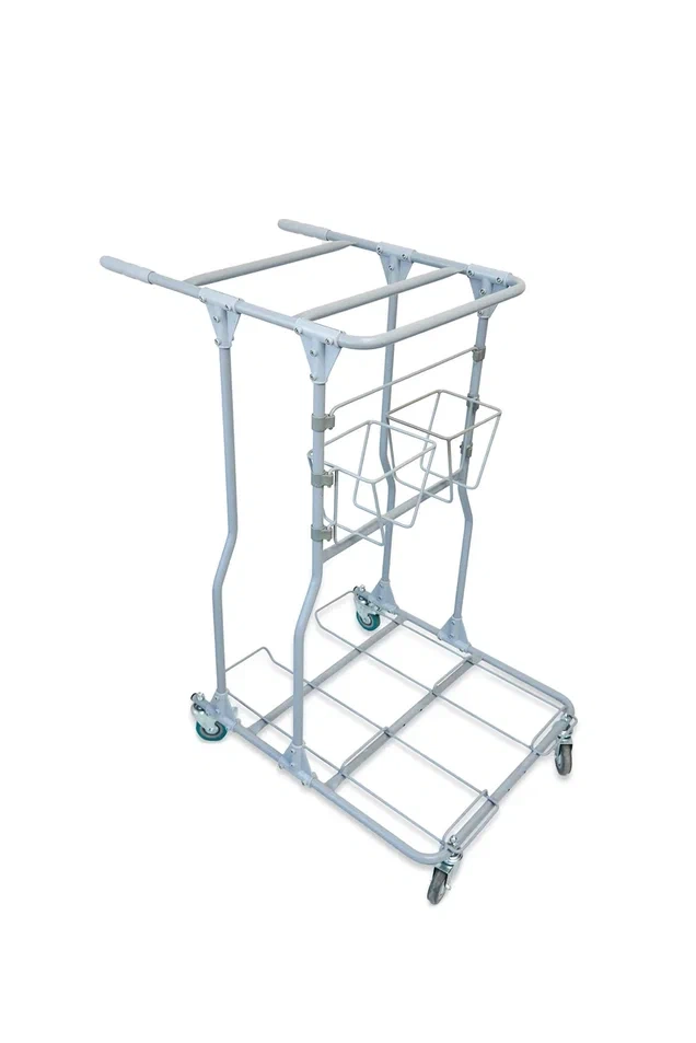 Сервисная тележка для уборки помещений имеет компактные размеры: 965 х 770 х 1068 см Конструкция сборно-разборная. Несущий элемент - металлическая труба диаметром 20 мм, покрытие - двойной слой порошковой краски.