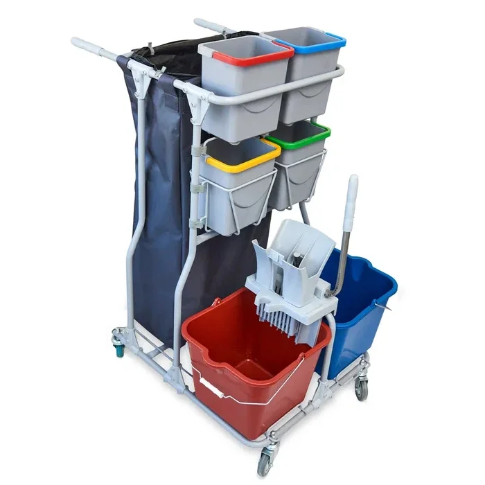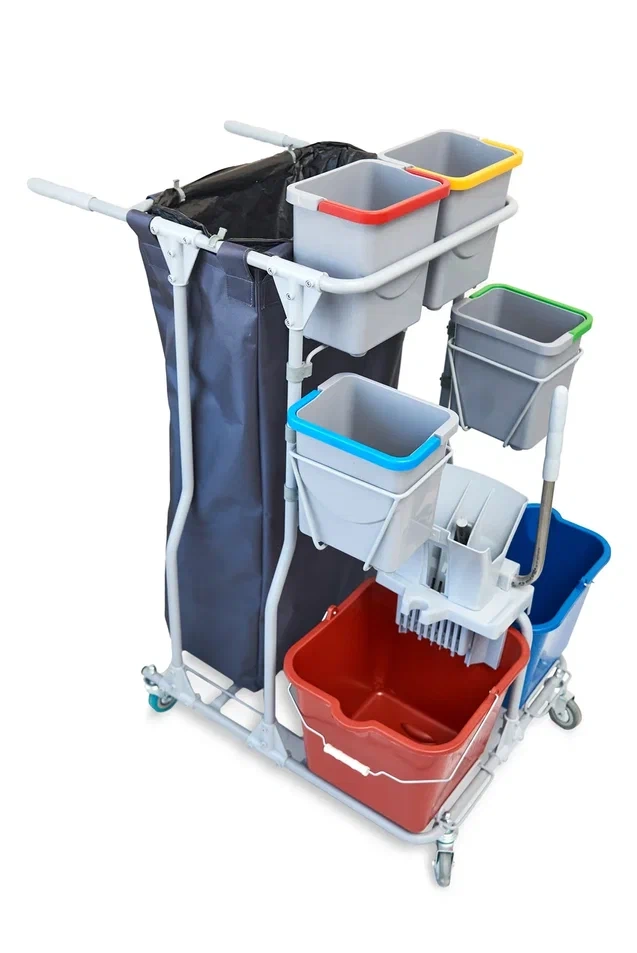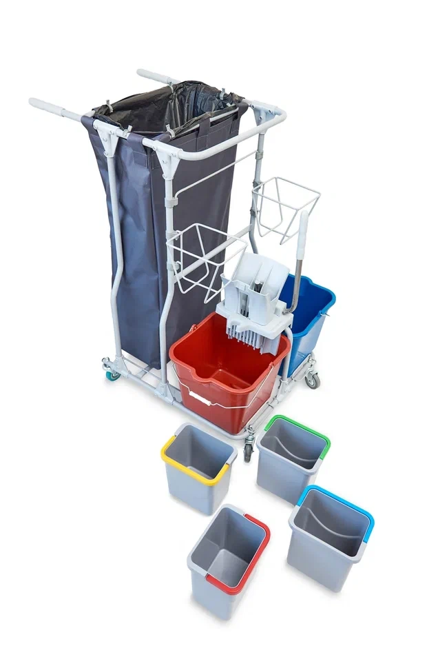 Элементы тележки собираются при помощи болтового соединения и пластиковых элементов. Сборно - разборная конструкция позволяет снизить издержки связанные с транспортировкой и складским хранением. В разобранном виде тележка занимает всего 45% от собранного состояния.Тележка комплектуется двумя ведрами по 20л, и четырьмя ведрами объемом 4л для влажных салфеток или различных расходных материалов, инвентаря, химии. Верхний ряд малых ведер вынимается вертикально вверх, нижний ряд малых ведер устанавливается в металлические корзины, которые крепятся на двойные пластиковые петли, которые обеспечивают компактное размещение при этом сохраняют удобство использования малых ведер.