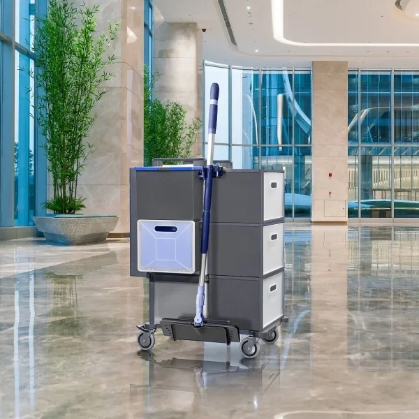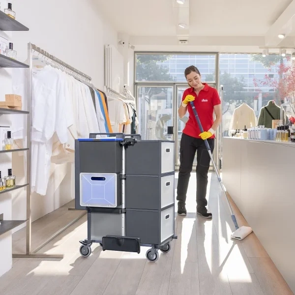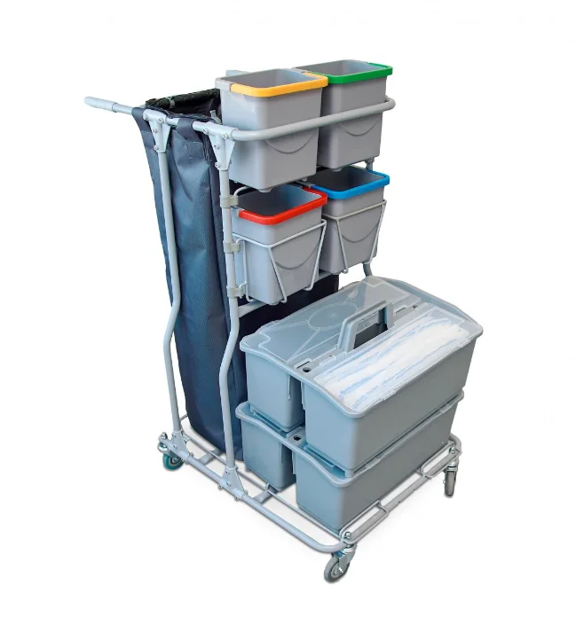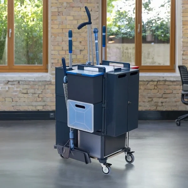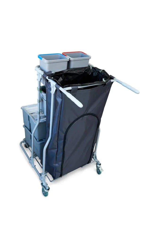 Многофункциональная тележка Шопстер вмещает все для уборки и позволяет обеспечить чистоту, эстетичный внешний вид и высокую производительность без ведер с водой.