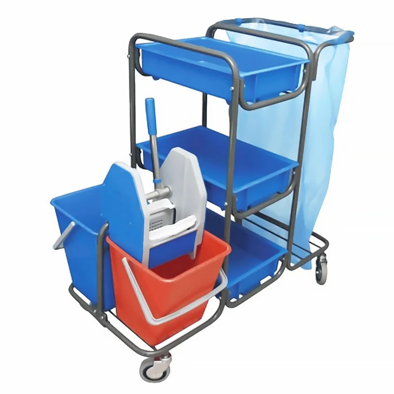 Тележка уборочная, универсальная. Предназначена для комплексной уборки помещений. Прочная и надежная конструкция, оборудована потивоударными бамперами. Комплектуется колесами 100 мм. Мешок для мусора из полиэтилена 120 л.