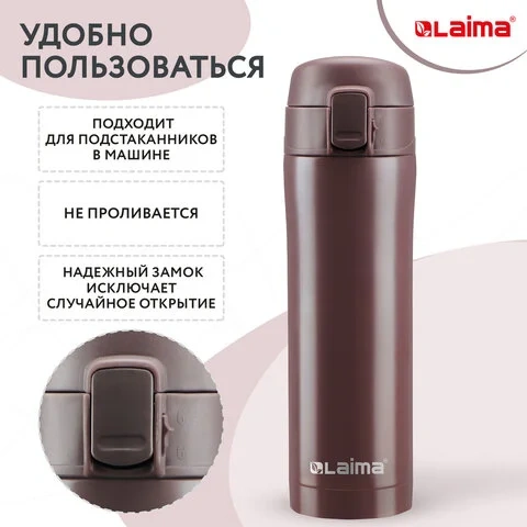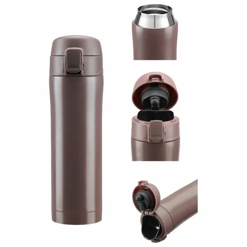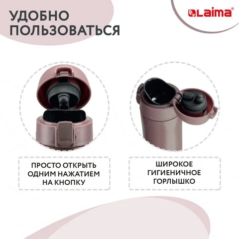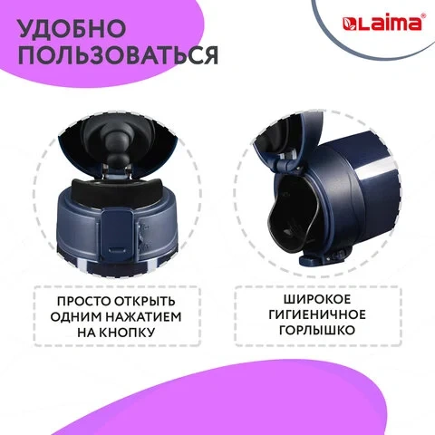 Термокружка снабжена откидывающейся крышкой с кнопкой, позволяющей с легкостью использовать ее одной рукой. Для защиты от непроизвольного нажатия кнопки предусмотрен специальный защитный замок-предохранитель.