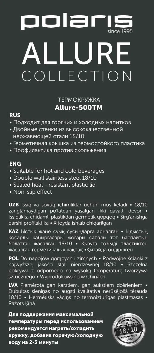 Вакуум между стенками обеспечивает сохранение температурного режима. Подходит для горячих и холодных напитков. Двойные стенки из высококачественной нержавеющей стали 18/10. Герметичная крышка из термостойкого пластика. 100% защита от случайного проливания. Профилактика против скольжения. Объем - 500мл. Индивидуальная упаковка - подарочный короб. При использовании термокружки для горячих напитков прогрейте кружку, залив в неё небольшое количества кипятка, ополосните и вылейте. Затем незамедлительно заполните кружку напитком и сразу заверните крышку, не закрывая её клапан, слегка встряхните, чтобы смочить все уплотнения, после чего через минуту плотно закройте клапан.