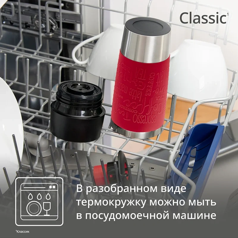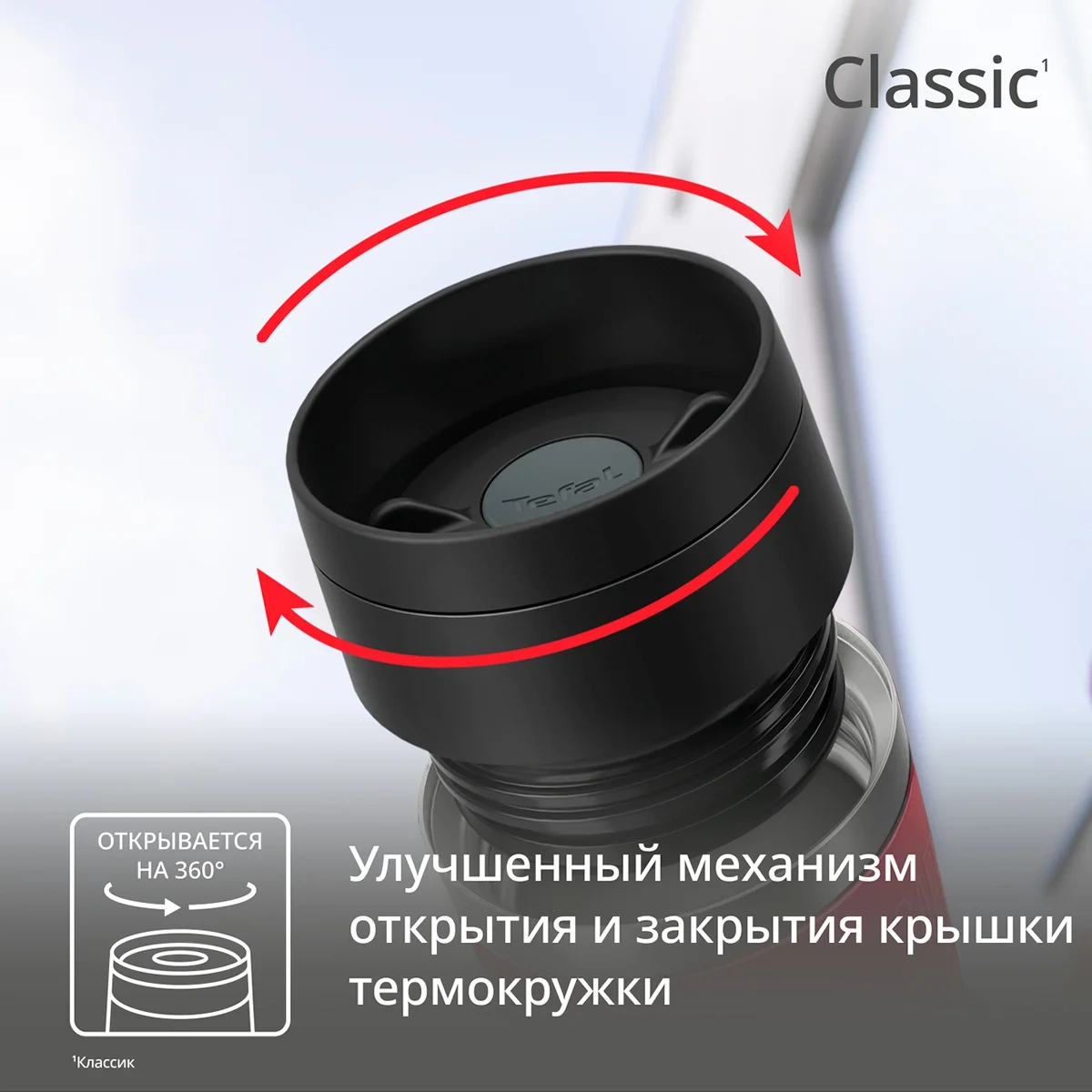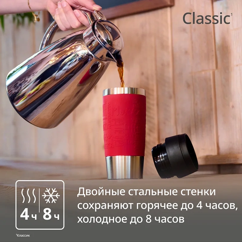 Термокружка Classic от Tefal поможет сохранить температуру вашего любимого напитка и наслаждаться им в течение всего дня. Ее удобная завинчивающаяся крышка с клапаном Quick Press позволяет открывать кружку одним нажатием и пить с любой стороны, а мягкий силиконовый манжет обеспечивает надежный и комфортный хват. Конструкция кружки полностью исключает протечки, а применение нержавеющей стали позволяет поддерживать напитки горячими до 4 часов, а холодными - до 8 часов.