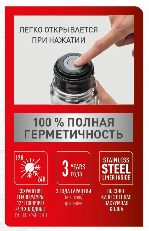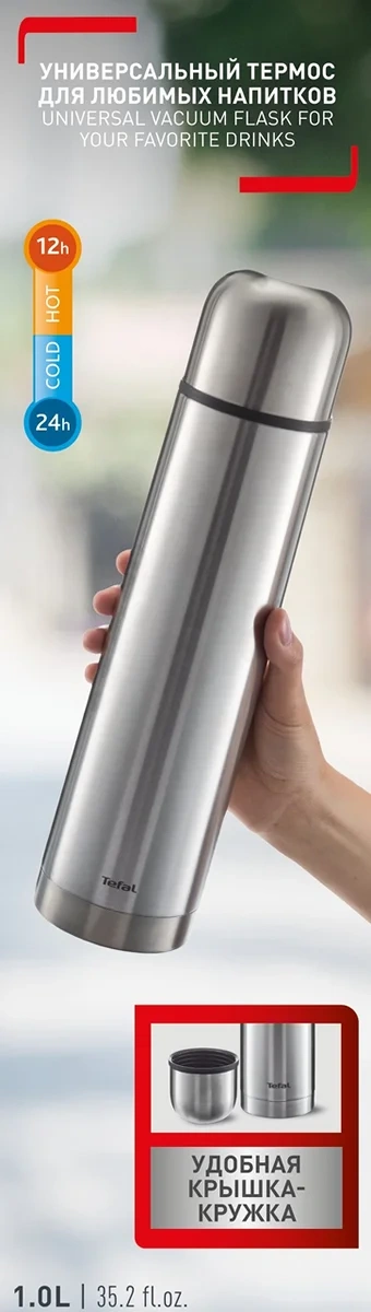 Термокружка Tefal Easy 2 Go Flask, 1л - откройте для себя незаменимый в путешествиях термос и наслаждайтесь любимыми напитками, куда бы вы ни отправились. Термос Tefal Easy2Go в стильном герметичном корпусе станет вашим идеальным компаньоном для длительных прогулок и пикников на природе. Выполненный из высококачественной нержавеющей стали, он поддерживает идеальную температуру горячих и холодных напитков в течение всего дня без протекания. Термос оснащен практичной крышкой, которую удобно использовать в качестве чашки.