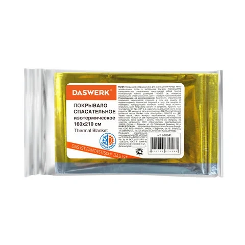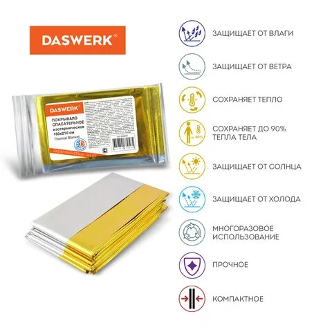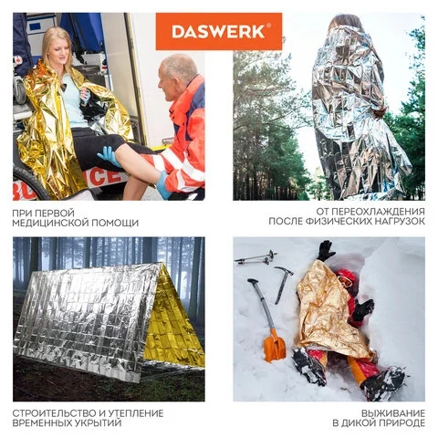 Термоодеяло/покрывало изотермическое серебро/золото спасательное 160х210 см, DASWERK, 630841