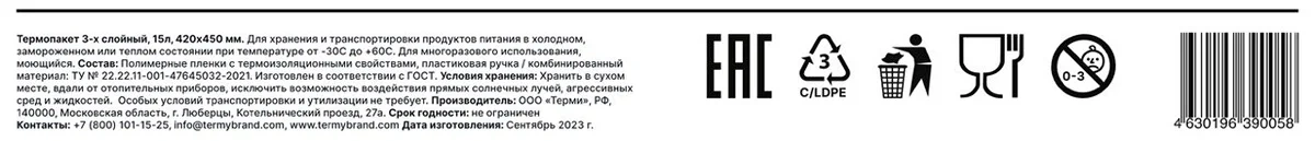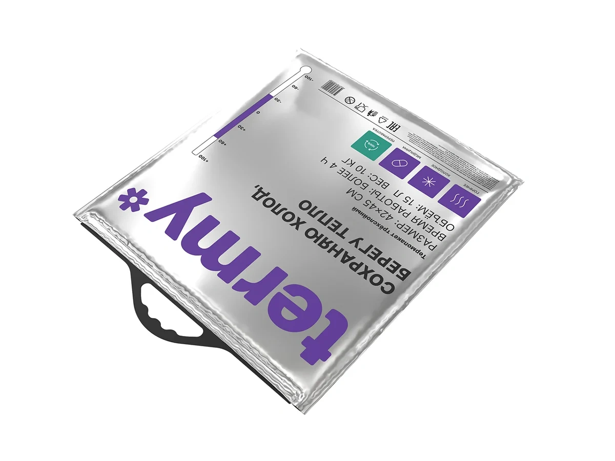 Термопакет Termy Standart трехслойные 420 x 450мм, 15л - трехслойный, многоразовый и прочный термопакет Терми предназначен для поддержания температуры охлаждённых или горячих продуктов питания. Сохраняет температуру более 4 часов, он вместительный и легко моется. Пакет-холодильник для продуктов - лёгкий и портативный способ защитить еду в дороге, идеально подходит для кемпинга, пикника, рыбалки и отдыха на природе. Термопакет не занимает много места, поэтому его легко положить в рюкзак или сумку, а анатомическая ручка-защелка не режет руки при транспортировке, надежно закрывает термопакет, удобно расстегивается. Многоразовый термо пакет изотермический это новый способ путешествий в комфорте с помощью хладогентов.