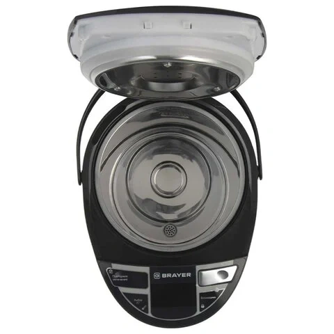 Корпус и внутренняя колба термопота выполнены из высококачественной нержавеющей стали, что обеспечивает долговечность и надёжность. Устройство оснащено LCD-дисплеем, на котором отображается текущая температура воды, что позволяет легко контролировать процесс нагрева.