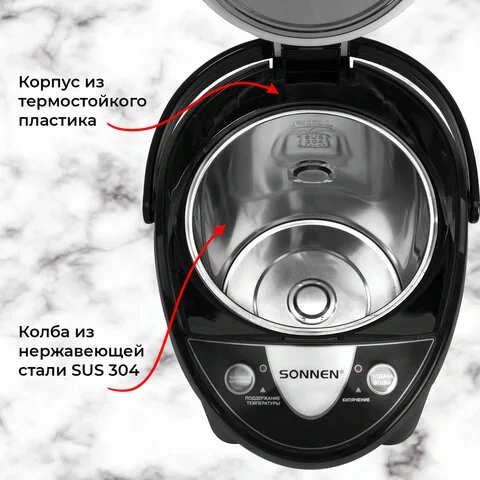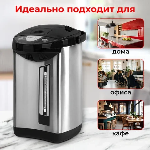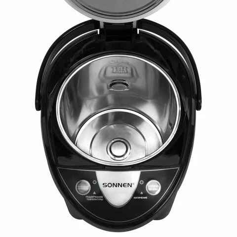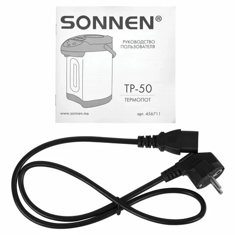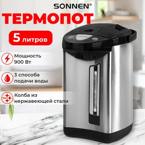 Термопот SONNEN TP-50, 5 л, 900 Вт, 1 температурный режим, 3 режима подачи воды, сталь, белый/серебр