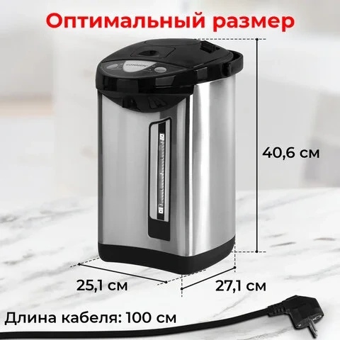 На корпусе размещена шкала уровня воды для контроля объема жидкости. Корпус дополнен прочной ручкой для удобного переноса устройства. Модель имеет вращающуюся подставку – вы можете поворачивать термопот в любую сторону, не поднимая над столом.