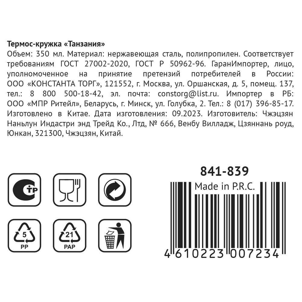 | Комплектация | термос-кружка с крышкой - 1 шт. |