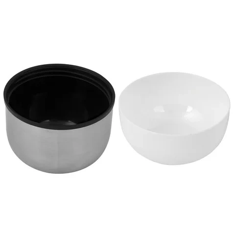 Термос диаметром 10 см и высотой 25 см выполнен в серебристом цвете.