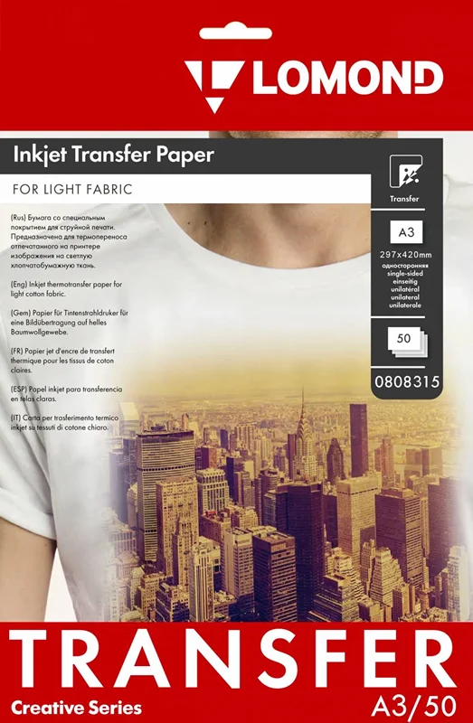 Термотрансфер в домашних условиях может изготовить любой желающий, без специального оборудования. Высококачественное полноцветное изображение, отпечатанное на цветном струйном принтере, затем с помощью термопресса или просто домашнего утюга переносится на светлую ткань. Майки, футболки, фуфайки с нанесенным изображением можно стирать. Картинка сохраняется и после 20 стирок. Покрытие выдерживает нагрев до 180°С. Пленка термотрансфер Lomond, позволяет изготовить высококачественные аппликации. Бумага термотрансферная Lomond для темных тканей представляет из себя непрозрачную белую пленку закрепленную на бумажной подложке. Это позволяет использовать термотрансферную пленку для темных тканей на всех видах струйных принтеров. Пленка хорошо впитывает чернила, отпечатки получаются высокого качества. После нанесения на хлопковую ткань остается белый матовый фон, его можно избежать если предварительно вырезать изображение по контуру.