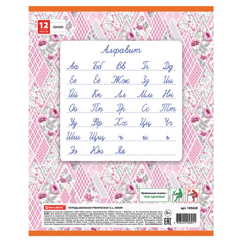 Внутренний блок плотностью 60 г/м2 из офсетной бумаги содержит 12 листов. Линовка - линия с полями. Обложка изготовлена из импортного мелованного картона. Скрепка надежно скрепляет листы между собой.