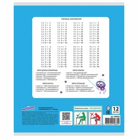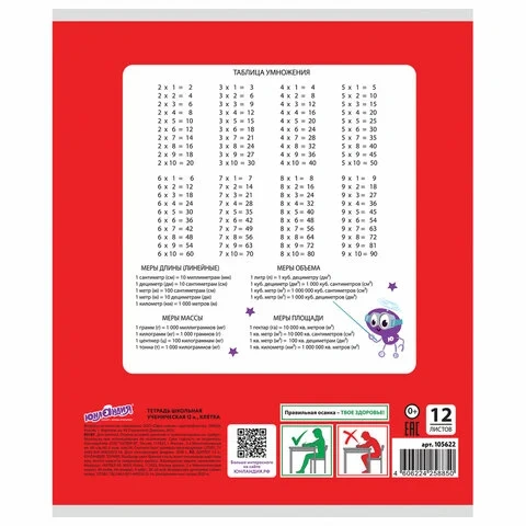 Внутренний блок плотностью 60 г/м2 из офсетной бумаги содержит 12 листов. Линовка - клетка с полями. Обложка изготовлена из импортного мелованного картона. Скрепка надежно скрепляет листы между собой. Идеально подходит для письма шариковыми, гелевыми и капиллярными ручками. Поставляется в нескольких вариантах цвета (без возможности выбора).