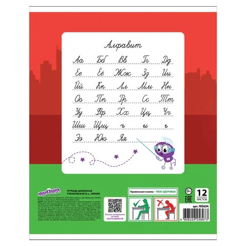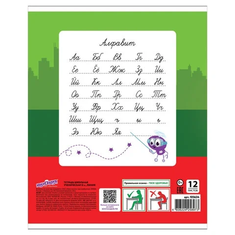Внутренний блок плотностью 60 г/м2 из офсетной бумаги содержит 12 листов. Линовка - линия с полями. Обложка изготовлена из импортного мелованного картона. Скрепка надежно скрепляет листы между собой.