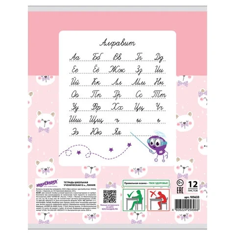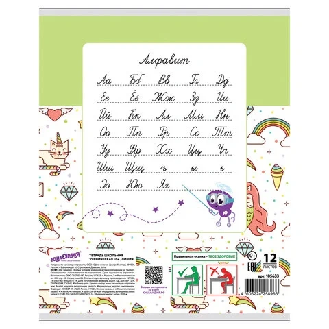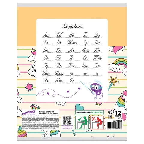 Внутренний блок плотностью 60 г/м2 из офсетной бумаги содержит 12 листов. Линовка - линия с полями. Обложка изготовлена из импортного мелованного картона. Скрепка надежно скрепляет листы между собой.
