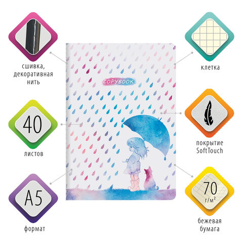 Тетрадь 40 л. в клетку обложка SoftTouch, бежевая бумага 70 г/м2, сшивка, А5 (147х210 мм), ДОЖДИК, B