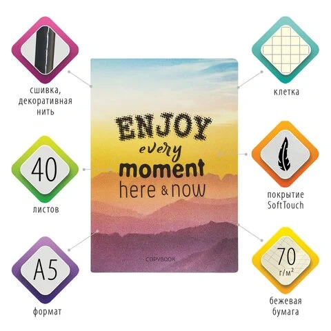 Тетрадь 40 л. в клетку обложка SoftTouch, бежевая бумага 70 г/м2, сшивка, А5 (147х210 мм), ENJOY THE