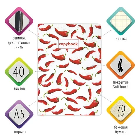 Тетрадь 40 л. в клетку обложка SoftTouch, бежевая бумага 70 г/м2, сшивка, А5 (147х210 мм), HOT PEPPE