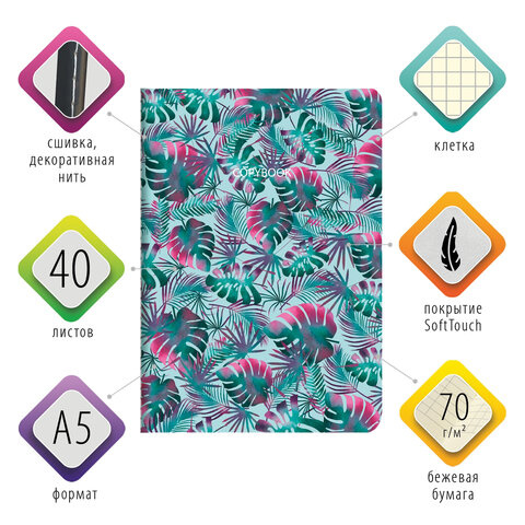 Общая тетрадь формата А5 содержит 40 листов с линовкой в клетку. Сшивка плотно соединяет листы. Обложка изготовлена из высококачественного импортного картона с двусторонней запечаткой, что придает тетради изысканный и неповторимый стиль. Специальное покрытие 'SoftTouch' с повышенными тактильными свойствами придает обложке мягкий, бархатистый эффект. Внутренний блок - тонированная офсетная бумага цвета слоновой кости плотностью 70 г/м2.