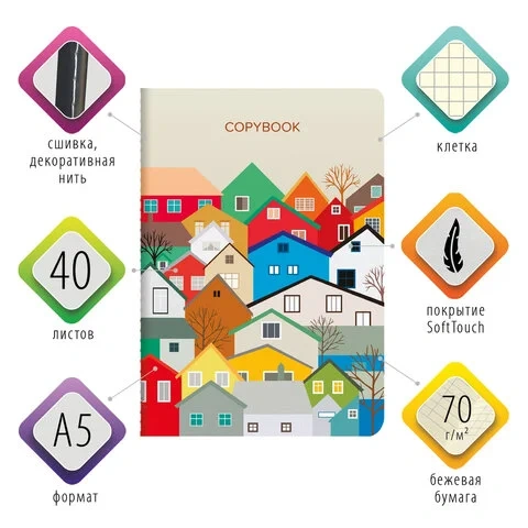Тетрадь 40 л. в клетку обложка SoftTouch, бежевая бумага 70 г/м2, сшивка, А5 (147х210 мм), УЮТНЫЙ ГО