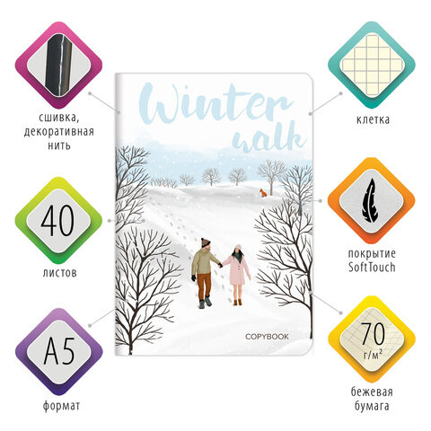 Тетрадь 40 л. в клетку обложка SoftTouch, бежевая бумага 70 г/м2, сшивка, А5 (147х210 мм), ЗИМНЯЯ ПР