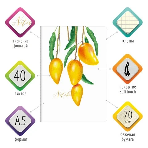 Общая тетрадь формата А5 содержит 40 листов с линовкой в клетку. Сшивка плотно соединяет листы. Обложка изготовлена из высококачественного импортного картона с двусторонней запечаткой, что придает тетради изысканный и неповторимый стиль. Специальное покрытие 'SoftTouch' с повышенными тактильными свойствами придает обложке мягкий, бархатистый эффект. Внутренний блок - тонированная офсетная бумага цвета слоновой кости плотностью 70 г/м2.