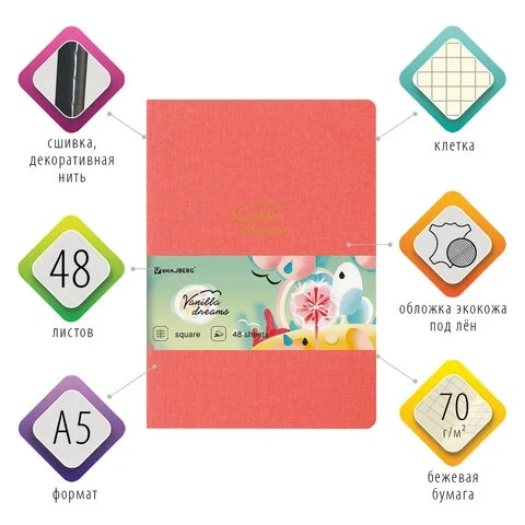 Общая тетрадь формата А5 (147х210 мм) содержит 48 листов с линовкой в клетку. Сшивка плотно соединяет листы. Обложка изготовлена из высококачественного и износоустойчивого материала - экокожи с текстурой под 'лен' кораллового цвета, что придает тетради изысканный и неповторимый стиль. Внутренний блок - бежевая офсетная бумага плотностью 70 г/м2.
