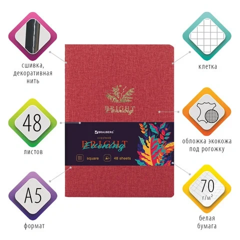 Общая тетрадь формата А5 (147х210 мм) содержит 48 листов с линовкой в клетку. Сшивка плотно соединяет листы. Обложка изготовлена из высококачественного и износоустойчивого материала - экокожи с текстурой под 'рогожку' красного цвета, что придает тетради изысканный и неповторимый стиль. Внутренний блок - белая офсетная бумага плотностью 70 г/м2.