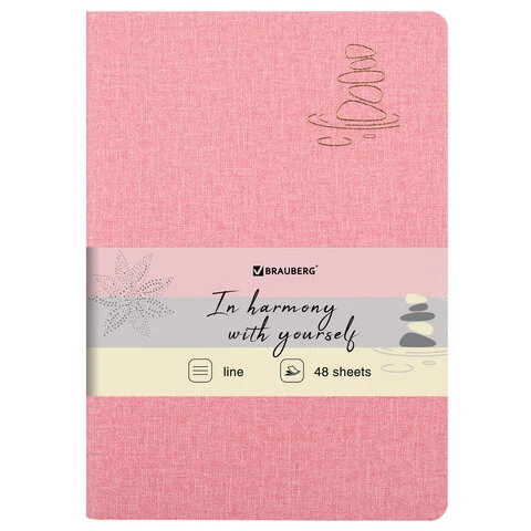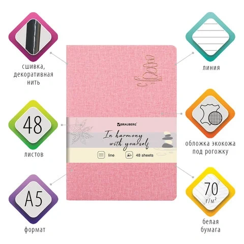 Тетрадь 48 л. в линию обложка кожзам под рогожку, сшивка, A5 (147х210мм), РОЗОВЫЙ, BRAUBERG HARMONY,