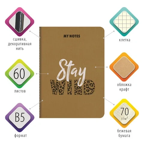 Общая тетрадь формата В5 содержит 60 листов с линовкой в клетку. Сшивка плотно соединяет листы. Обложка изготовлена из высококачественного импортного крафт-картона с двусторонней запечаткой, что придает тетради изысканный и неповторимый стиль. Внутренний блок - тонированная офсетная бумага цвета слоновой кости плотностью 70 г/м2.