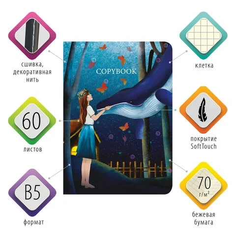 Общая тетрадь формата B5 содержит 60 листов с линовкой в клетку. Сшивка плотно соединяет листы. Обложка изготовлена из высококачественного импортного картона с двусторонней запечаткой, что придает тетради изысканный и неповторимый стиль. Специальное покрытие 'SoftTouch' с повышенными тактильными свойствами придает обложке мягкий, бархатистый эффект. Внутренний блок - тонированная офсетная бумага цвета слоновой кости плотностью 70 г/м2.