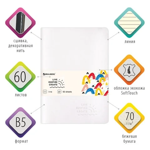 Отзывы о «Тетрадь 60 л. в линию обложка кожзам SoftTouch, сшивка, B5 (179х250мм), БЕЛЫЙ, BRAUBERG RAINBOW, 403»
