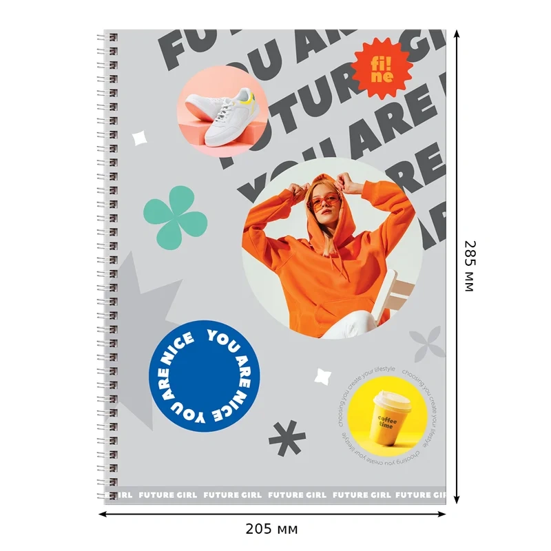 Тетрадь BG серии Future girl формата А4 (205*285 мм) на гребне состоит из 80 листов и отлично подходит для конспектов, работы и ведения документооборота. Внутренний блок – офсетная бумага плотностью 60 г/м?, белизна – 100%, линовка – клетка без полей. Твёрдая обложка тетради изготовлена из мелованного картона с матовой ламинацией и выборочным лакированием. Обложка выполнена в современном ярком дизайне.