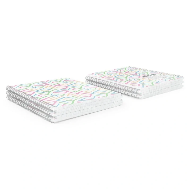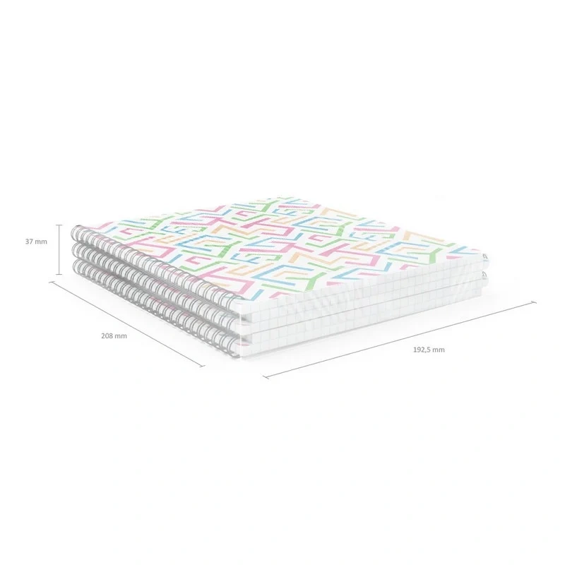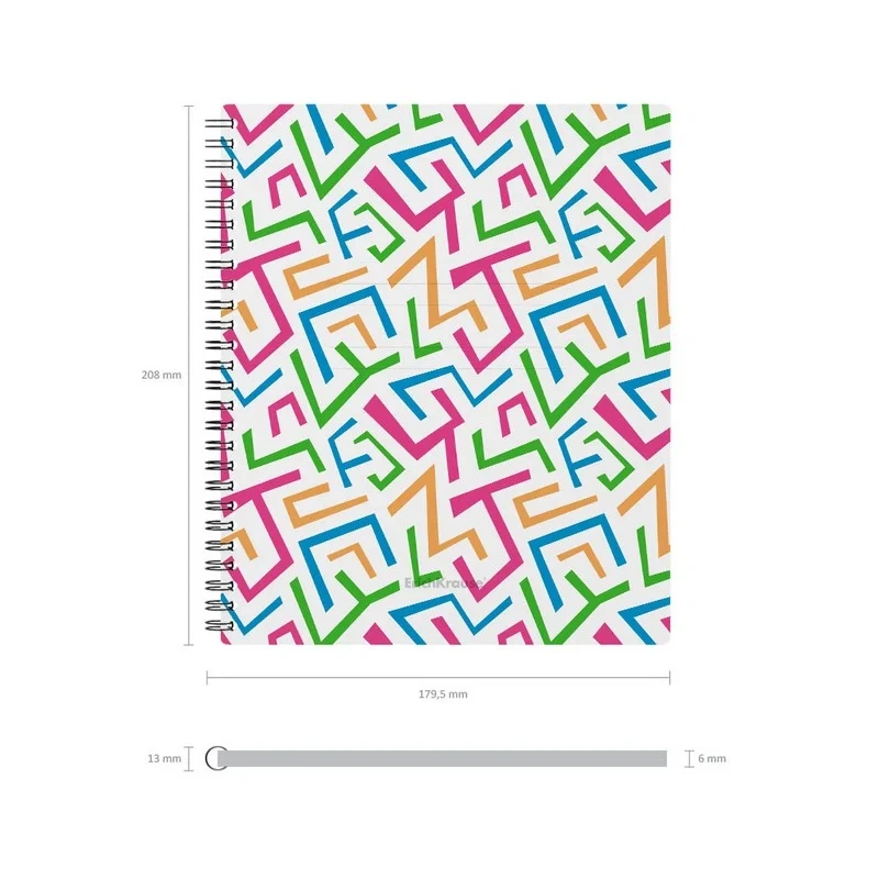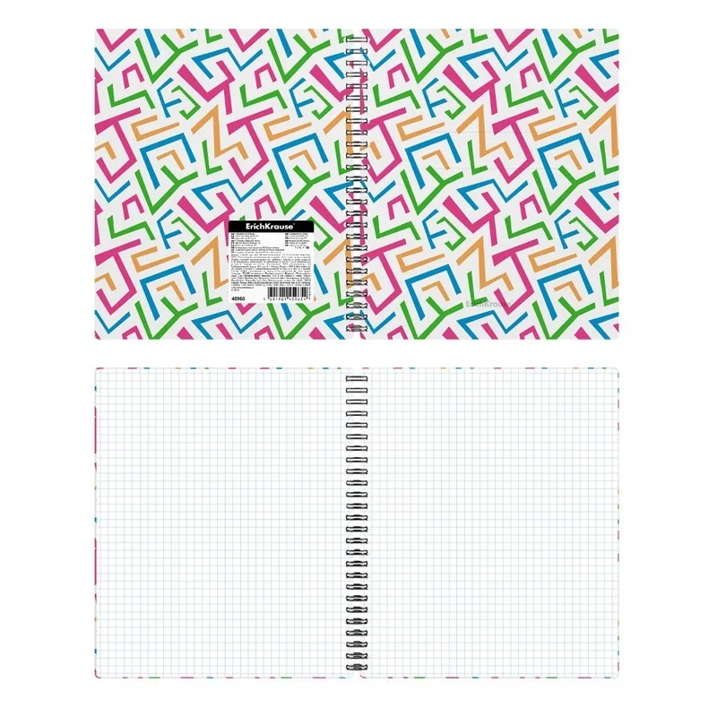 Тетрадь общая формата А5+ (170х205 мм). Обложка из высококачественного износостойкого матового пластика с фактурой «песок». Эффектный стильный дизайн выполнен печатью неоновыми красками. В блоке 60 листов в клетку. Бумага офсетная плотностью 55 г/м2. Цвет линовки - синий. Скругленные уголки обложки. Тип скрепления - спираль. Тетради упакованы в термоусадочную пленку по 5 штук.