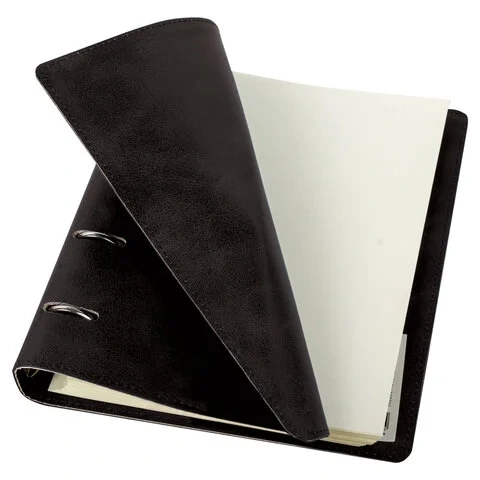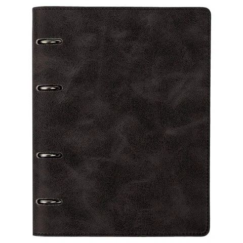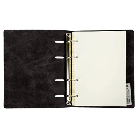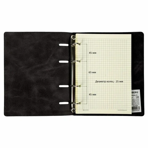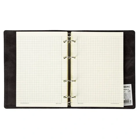 Блок состоит из 120 листов офсетной бумаги кремового цвета плотностью 70 г/м2. Линовка - клетка с полями. Мягкая интегральная обложка с прошивкой по периметру и вырубкой под кольца выполнена из износоустойчивого материала с текстурой под гладкую кожу черного цвета. Формат А5 является стандартным и обеспечивает комфортное ношение в рюкзаке/ранце или папке. Оборудована кольцевым механизмом с 4-мя кольцами для подшивки сменных блоков, что позволит носить на учебу/работу всего одну тетрадь с возможностью добавлять и менять листы.