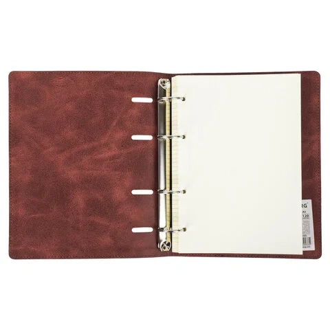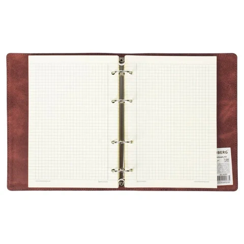 Блок состоит из 120 листов офсетной бумаги кремового цвета плотностью 70 г/м2. Линовка - клетка с полями. Мягкая интегральная обложка с прошивкой по периметру и вырубкой под кольца выполнена из износоустойчивого материала с текстурой под гладкую кожу коричневого цвета. Формат А5 является стандартным и обеспечивает комфортное ношение в рюкзаке/ранце или папке. Оборудована кольцевым механизмом с 4-мя кольцами для подшивки сменных блоков, что позволит носить на учебу/работу всего одну тетрадь с возможностью добавлять и менять листы.