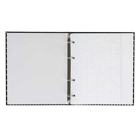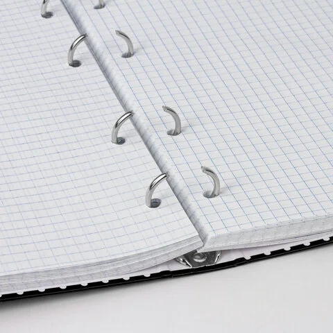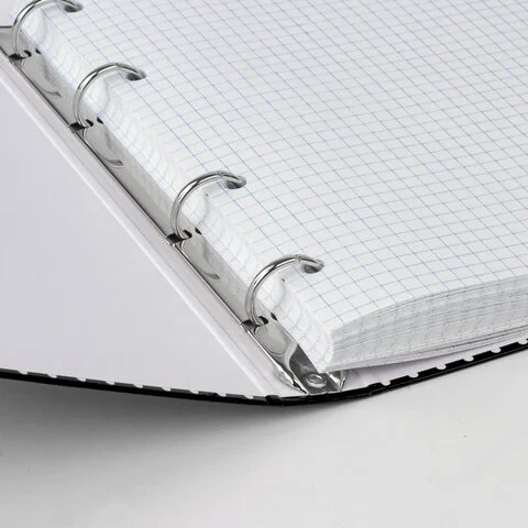 Блок состоит из 120 листов офсетной бумаги белого цвета плотностью 60 г/м2. Линовка - клетка. Жесткая книжная обложка выполнена из переплетного картона и покрыта глянцевой пленкой. Формат А5 является стандартным и обеспечивает комфортное ношение в рюкзаке/ранце или папке. Оборудована кольцевым механизмом с 4-мя кольцами для подшивки сменных блоков, что позволит носить на учебу/работу всего одну тетрадь с возможностью добавлять и менять листы.