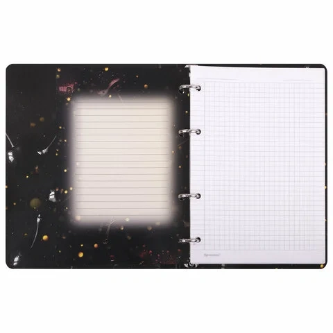Блок состоит из 120 листов офсетной бумаги белого цвета плотностью 60 г/м2. Линовка – клетка. Обложка выполнена из плотного слим-картона с высечкой под кольцевой механизм, имеет цветной форзац и покрытие матовой пленкой с тиснением фольгой. Формат А5 является стандартным, поэтому тетрадь удобно носить в рюкзаке/ранце или папке.