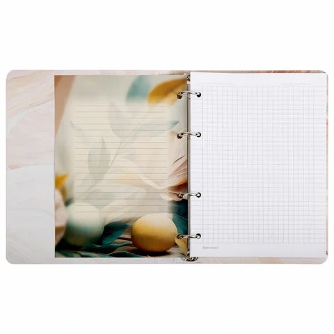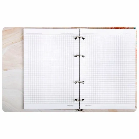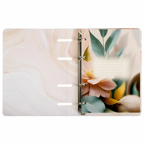 Снабжена кольцевым механизмом с 4 кольцами для подшивки сменных блоков, что позволит брать на учебу/работу всего одну тетрадь с возможностью добавлять и менять листы.