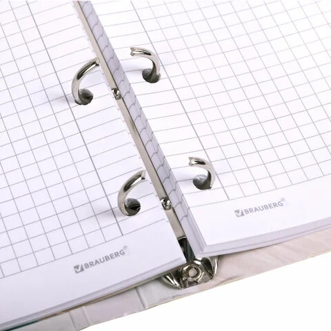 Блок состоит из 120 листов офсетной бумаги белого цвета плотностью 60 г/м2. Линовка – клетка. Обложка выполнена из плотного слим-картона с высечкой под кольцевой механизм, имеет цветной форзац и покрытие матовой пленкой с тиснением фольгой. Формат А5 является стандартным, поэтому тетрадь удобно носить в рюкзаке/ранце или папке.