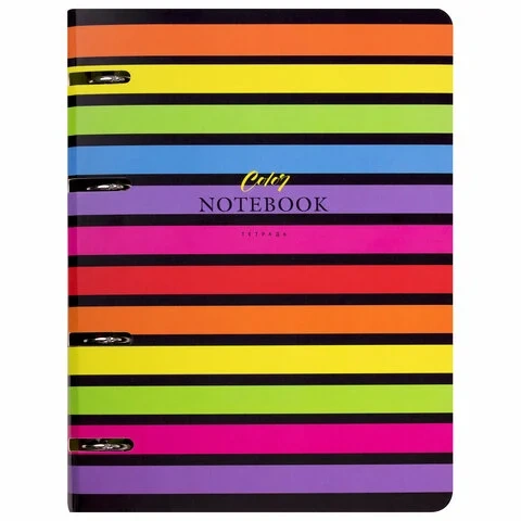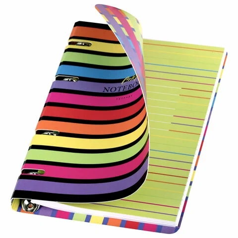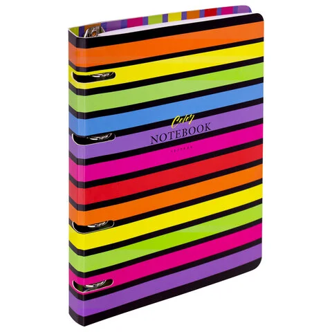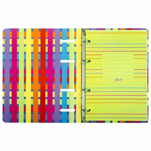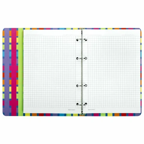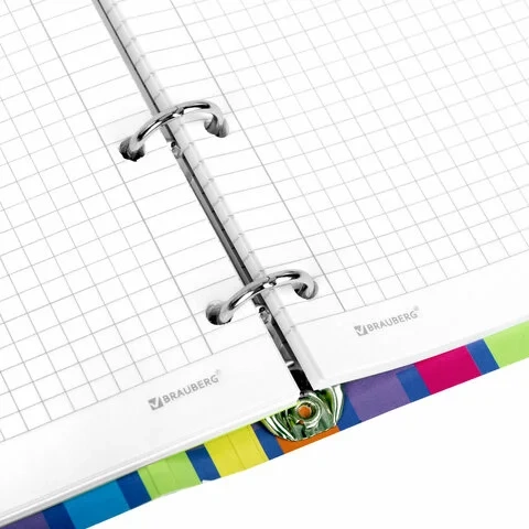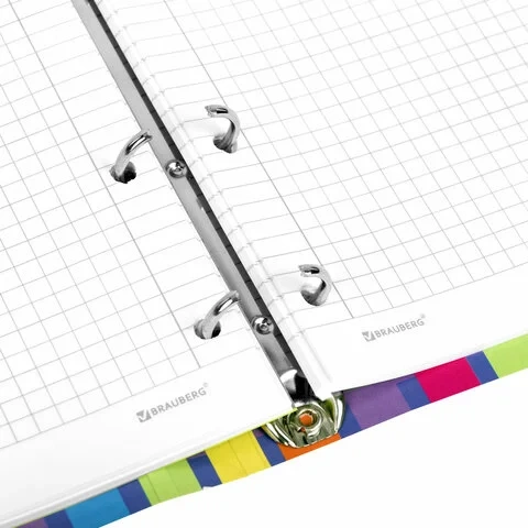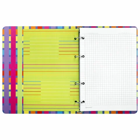 Блок состоит из 120 листов офсетной бумаги белого цвета плотностью 60 г/м2. Линовка – клетка. Обложка выполнена из плотного слим-картона с высечкой под кольцевой механизм, имеет цветной форзац и покрытие матовой пленкой. Формат А5 является стандартным, поэтому тетрадь удобно носить в рюкзаке/ранце или папке.
