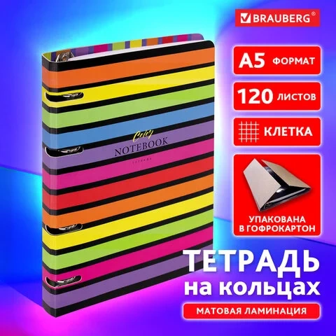 Тетрадь на кольцах А5 160х212 мм, 120 листов, картон, матовая ламинация, клетка, BRAUBERG, 'Colors',